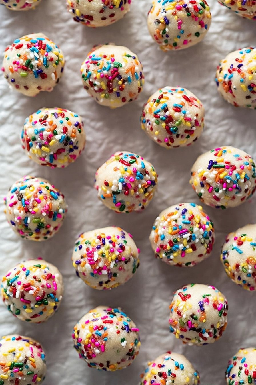 One thing I’ve noticed is that the sprinkles can sometimes bleed a little bit of color if the balls sit for too long. It’s just cosmetic and doesn’t affect the taste at all. If you want them to look pristine for a party or photos, roll them in fresh sprinkles right before serving. Or just embrace the tie dye look. I think it adds character.