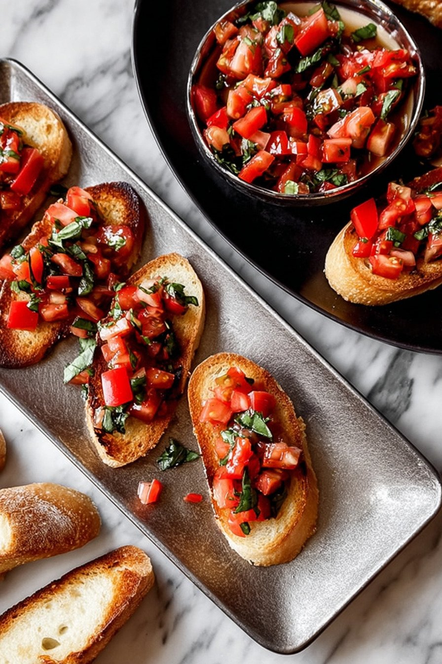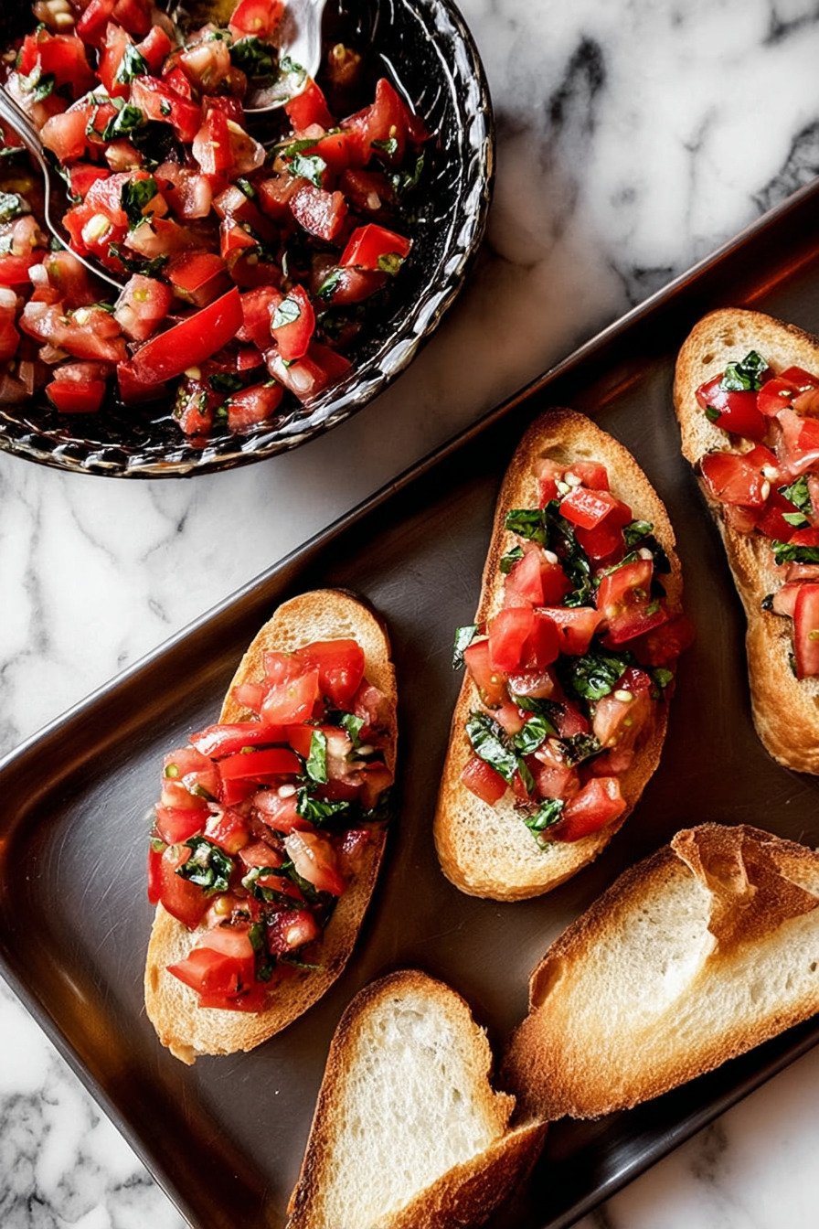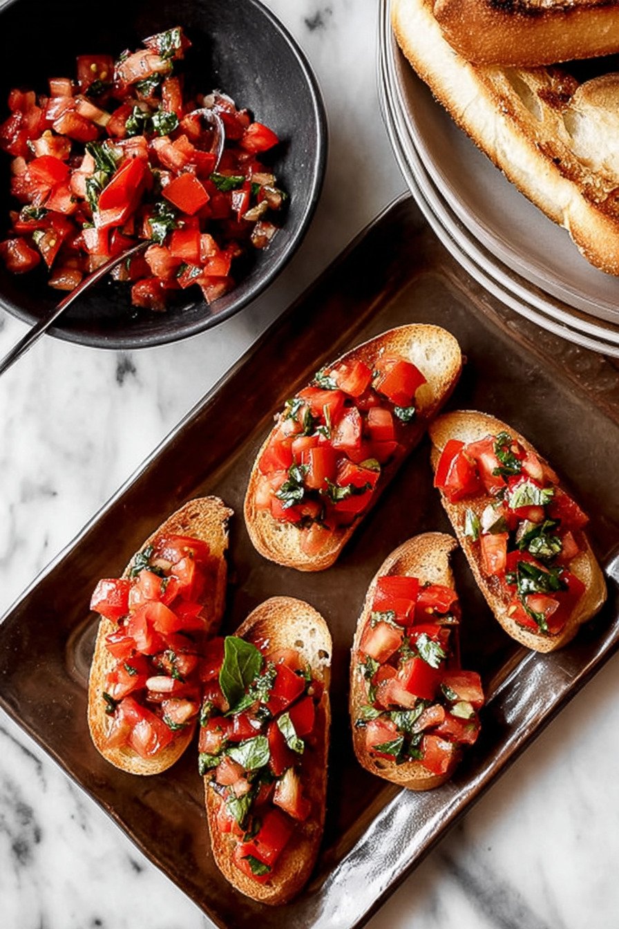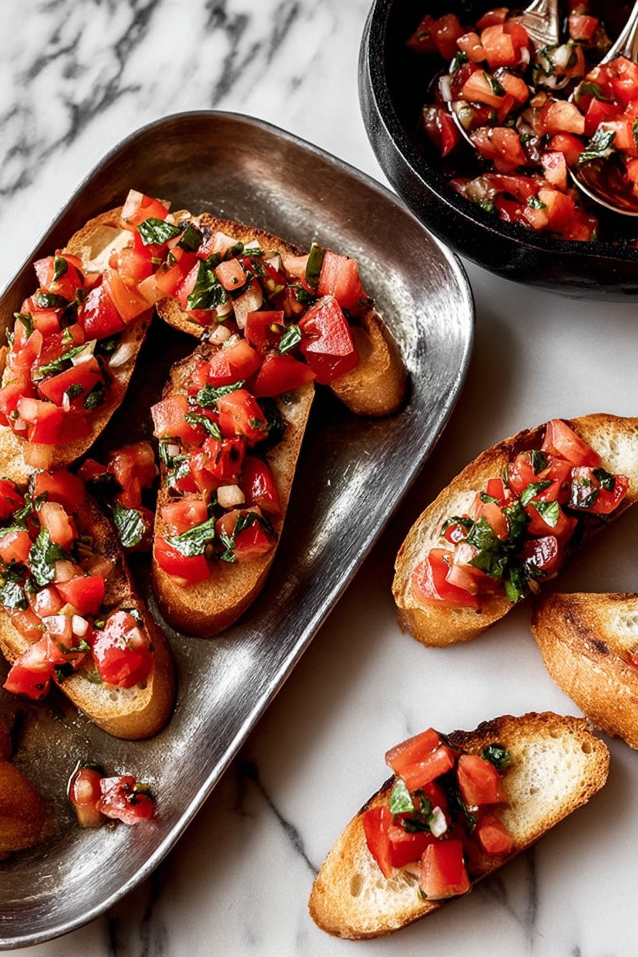 Season in layers. A little salt in the tomatoes. A sprinkle on the toast. A pinch at the end. That trick wakes flavor without heavy hands. For a party run, double the batch and set up a build station. Guests top their own and the bread stays crisp. That is the best bruschetta recipe move I know.