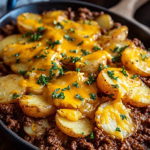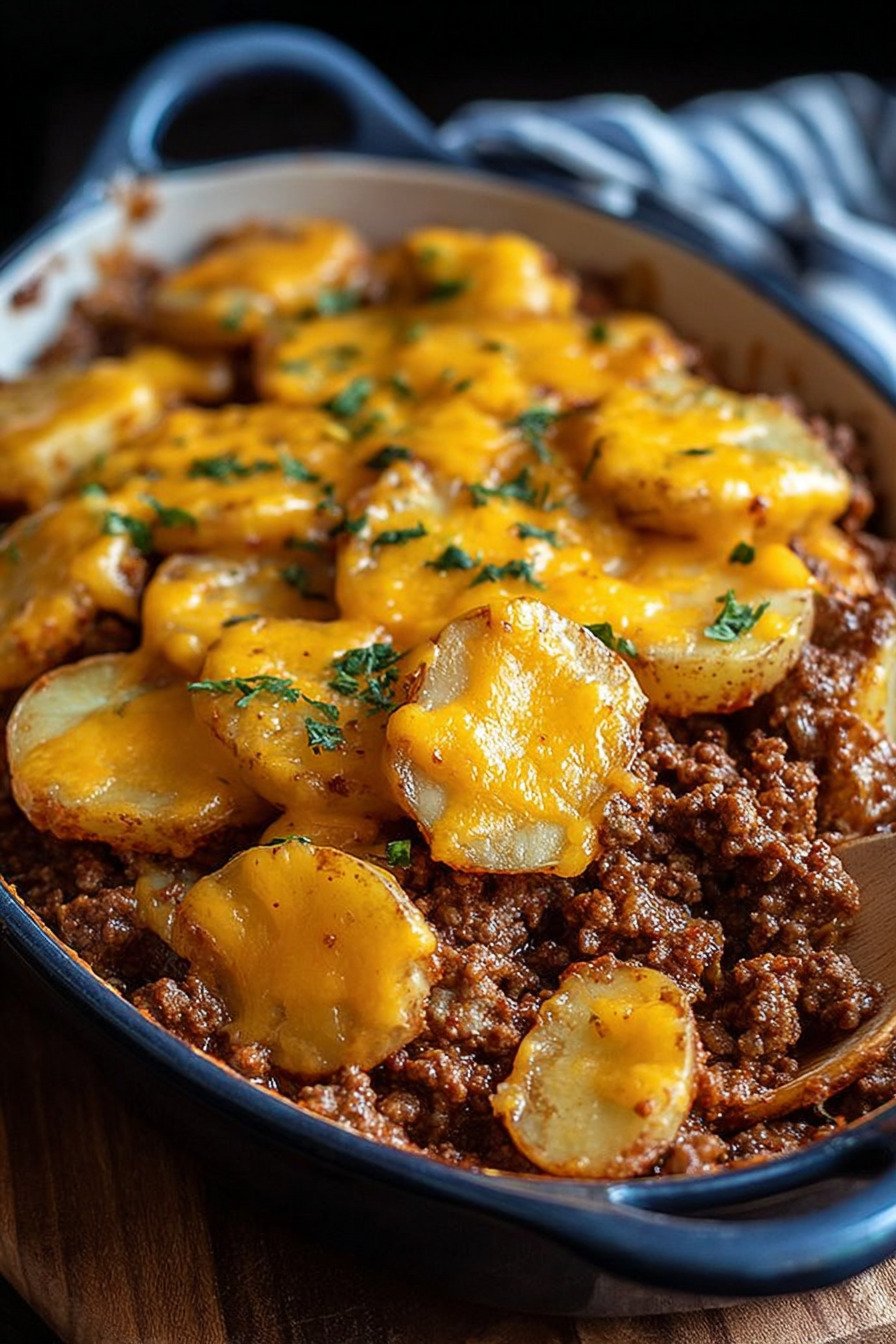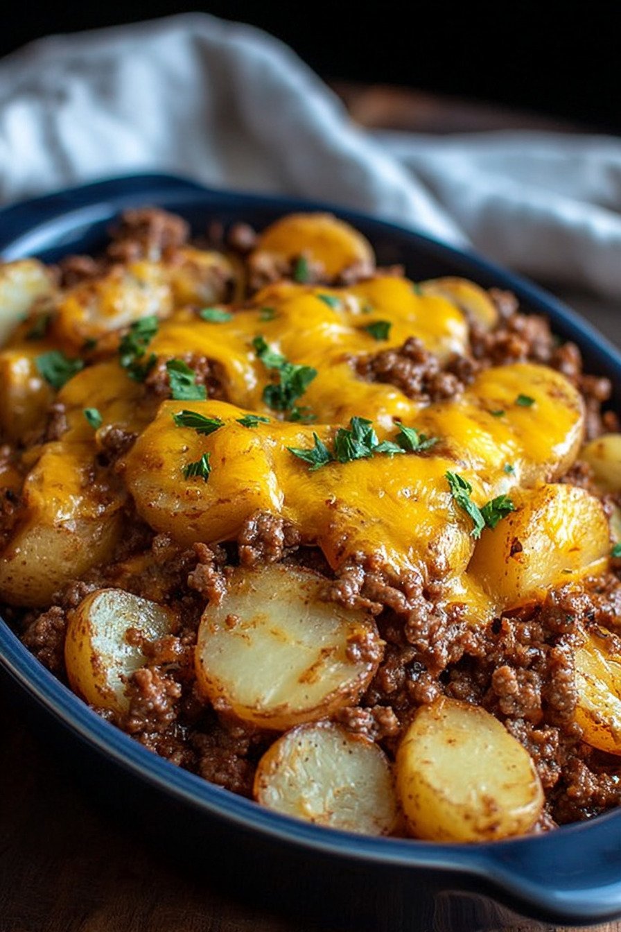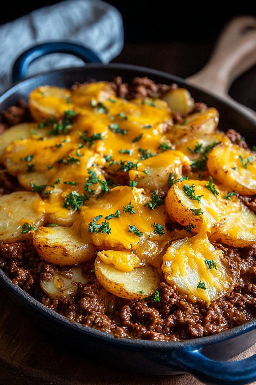 Leftovers keep well and taste even better the next day. Place the cooled food in airtight containers and store in the fridge for three to four days. Reheat in a skillet over low heat with a spoon of water to refresh the steam and keep the potatoes tender. The cheese turns smooth again and the beef warms through without drying out.