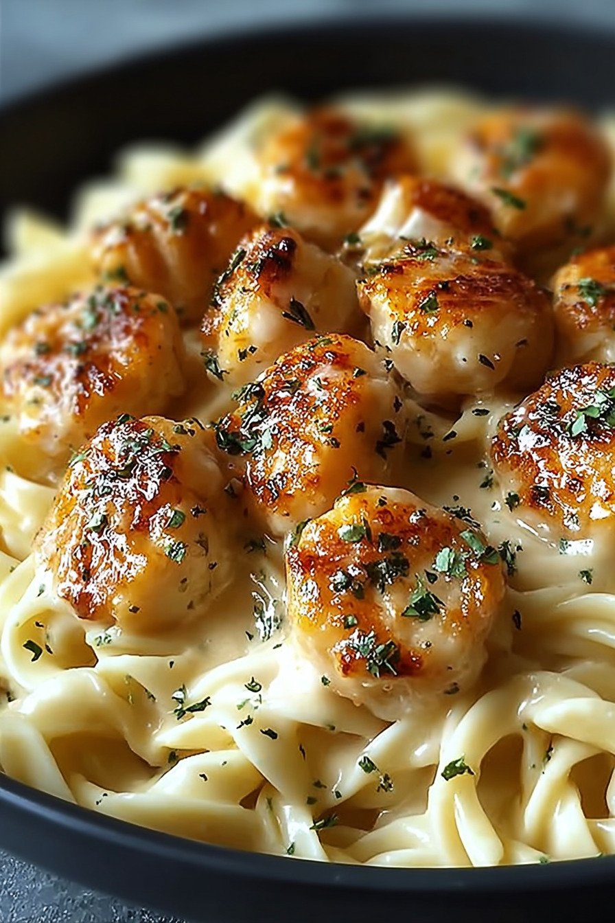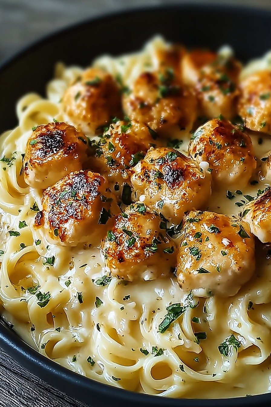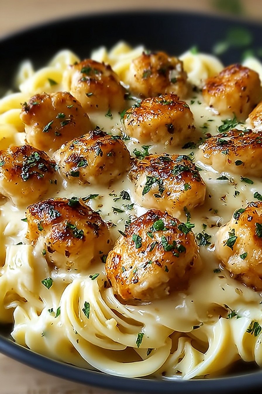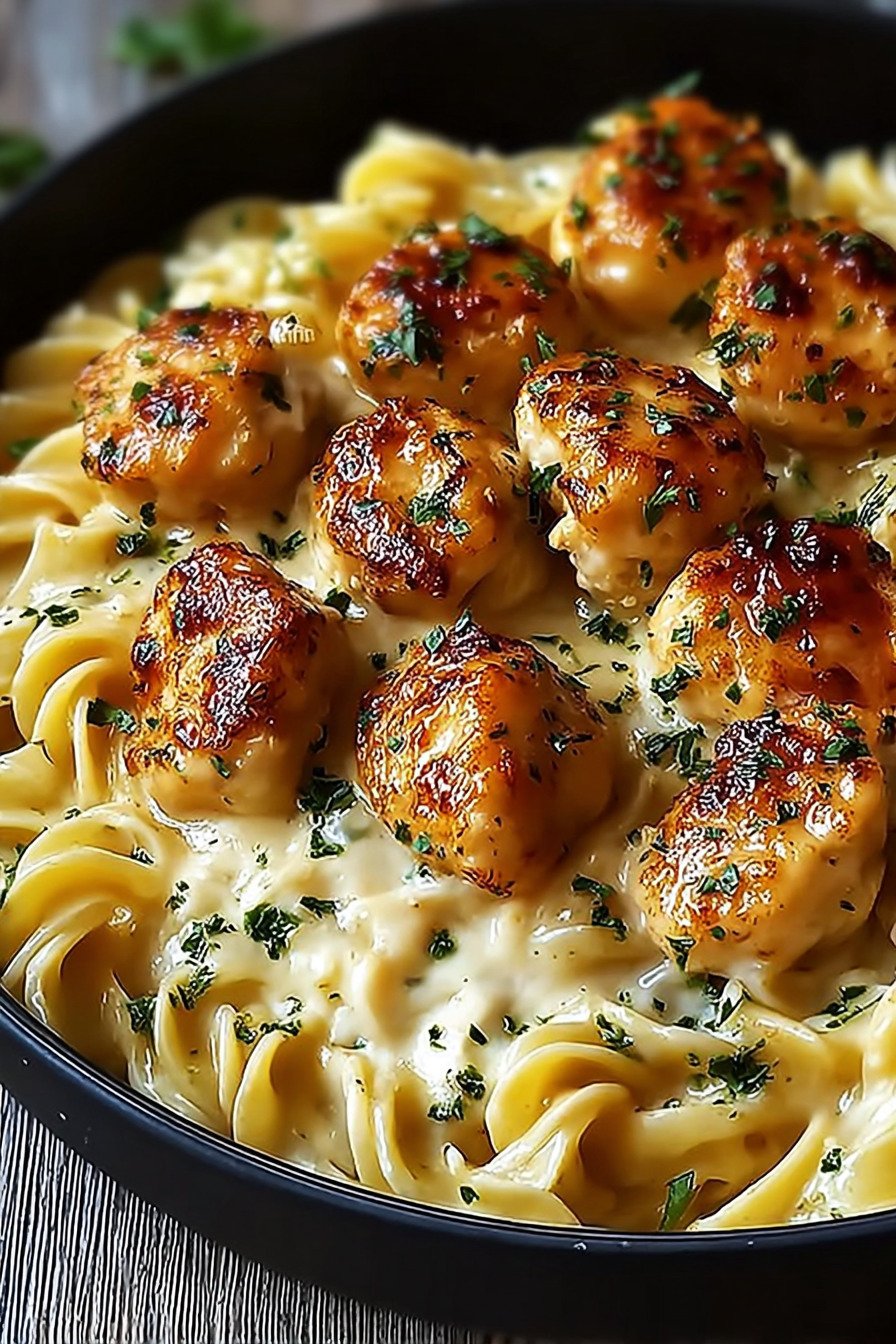 9) Garlic Butter Chicken Bites with Creamy Parmesan Pasta
