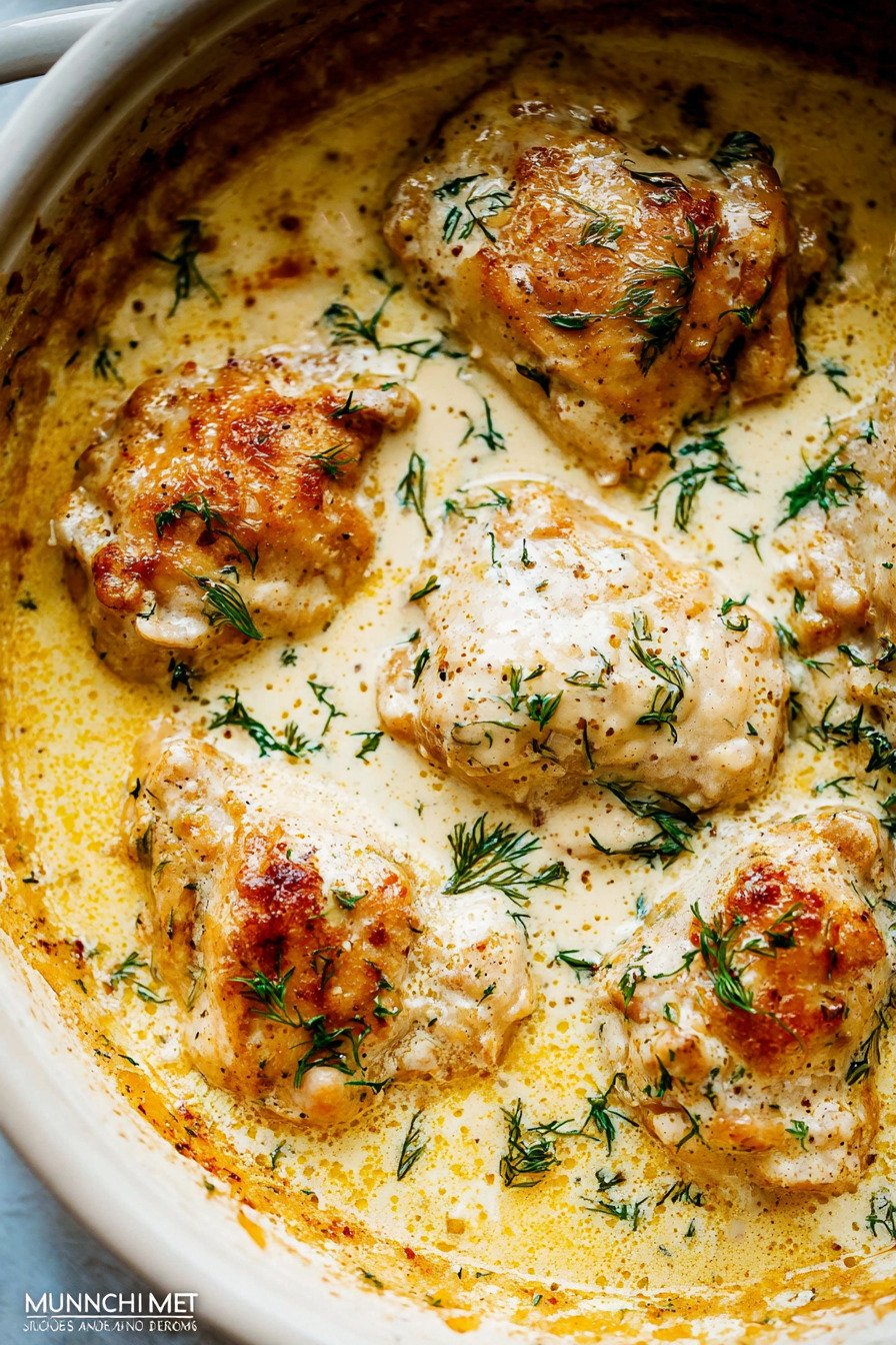- Juicy thighs sear then bake in a simple garlic cream with Parmesan.