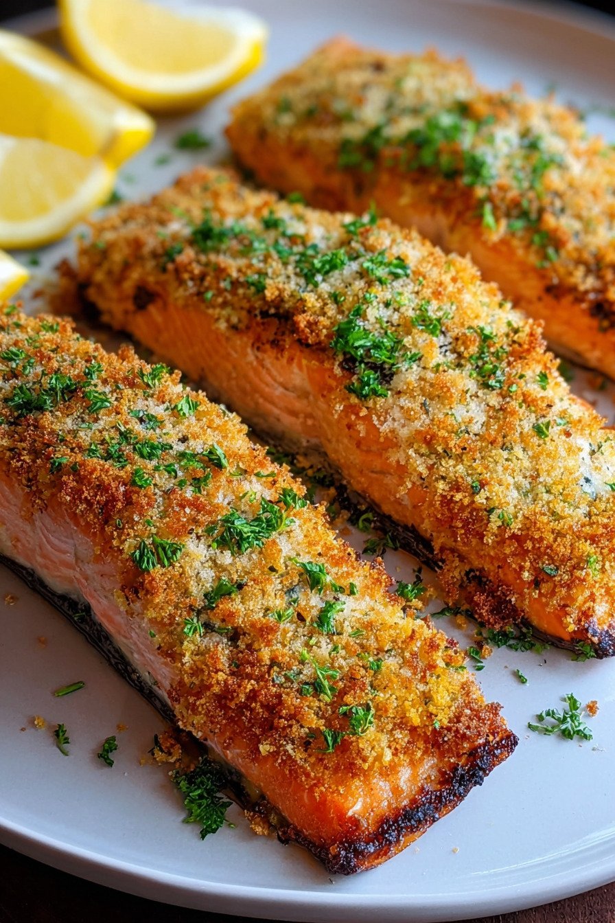 Pair the fish with roasted broccoli or a green salad for a balanced plate. For a full salmon dish that kids love serve with buttered rice and lemon slices. I keep a jar of extra crumb mix in the freezer which saves time on weeknights and supports my plan for seafood recipes with salmon that we cook on repeat.