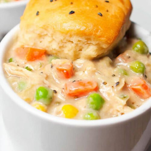 Refrigerated Biscuit Dough Instead of a traditional crust, warm baked biscuits top the creamy filling, delivering that nostalgic pot pie feel without complicated pastry work.