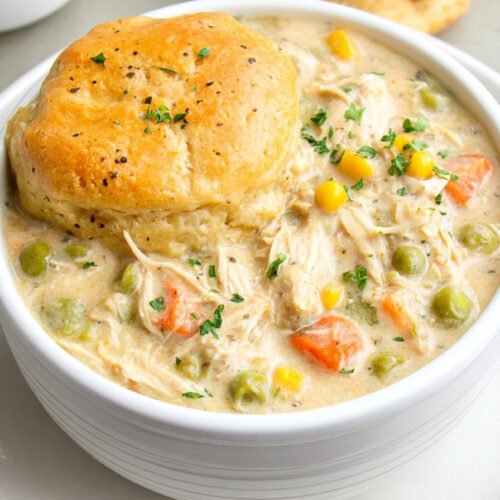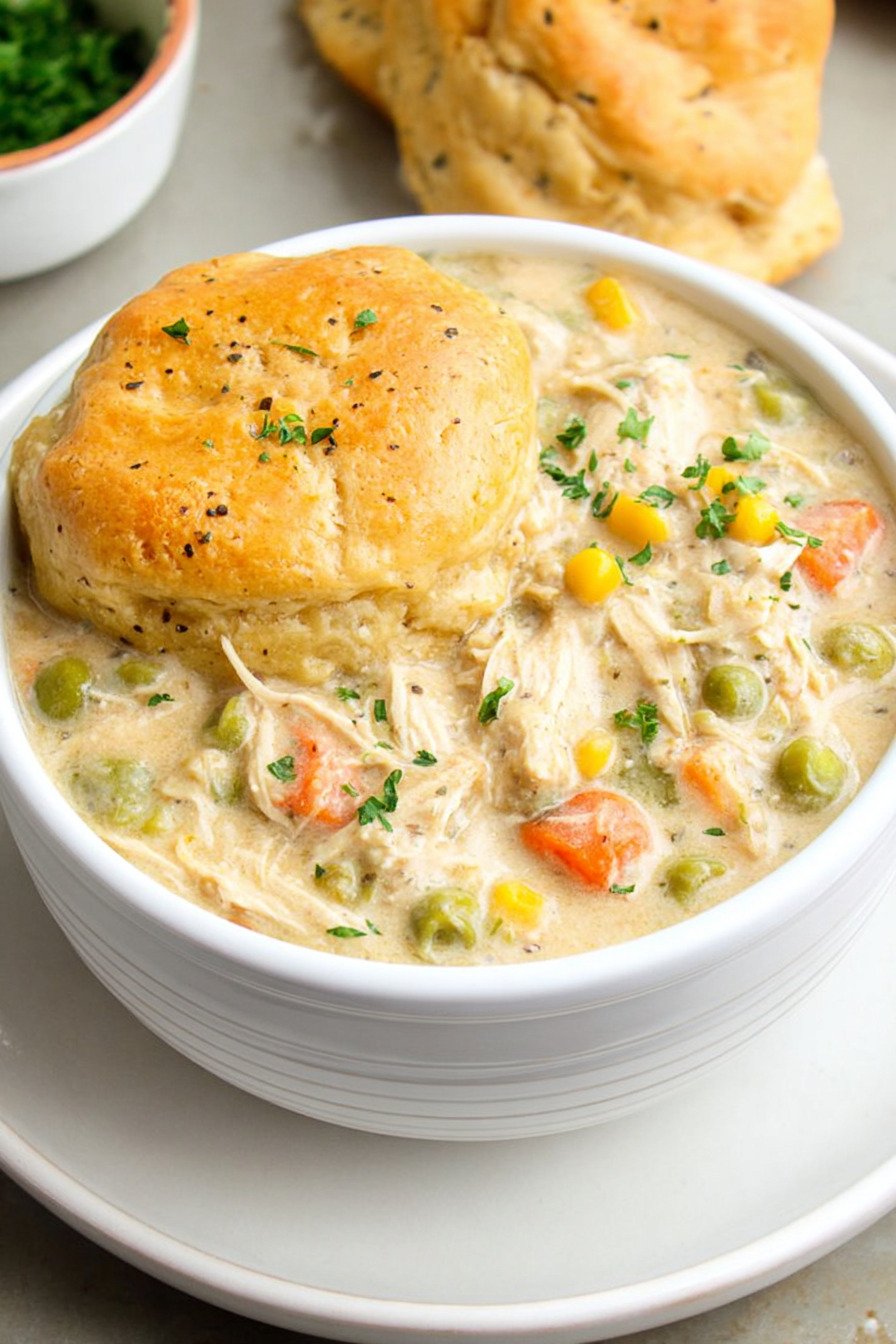 This version keeps steps short. We use pantry soups, broth, and frozen vegetables. The chicken stays juicy. The sauce turns silky. The bite reads cozy not heavy. The crumbs from the biscuit feel like gold at the bottom of the bowl.