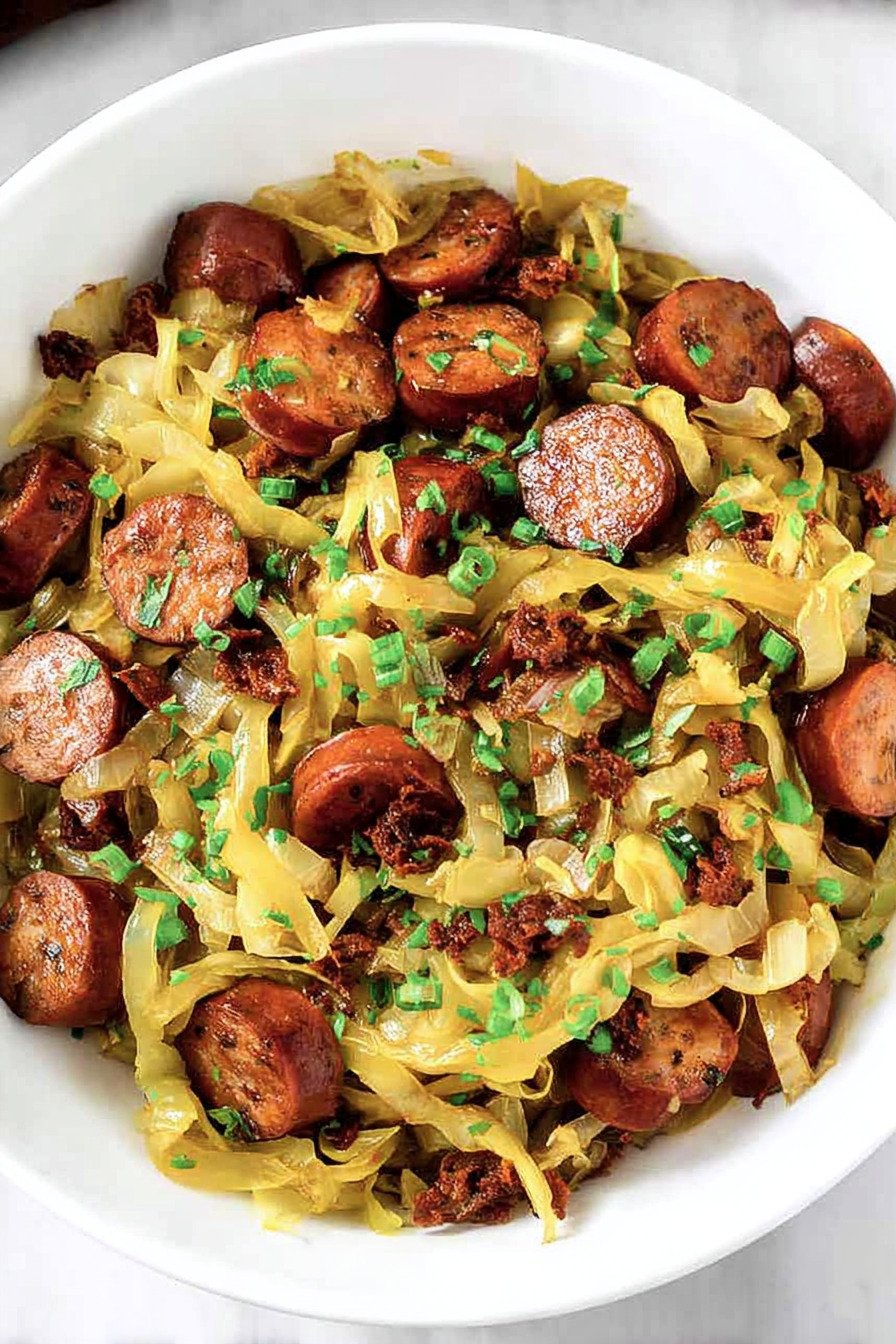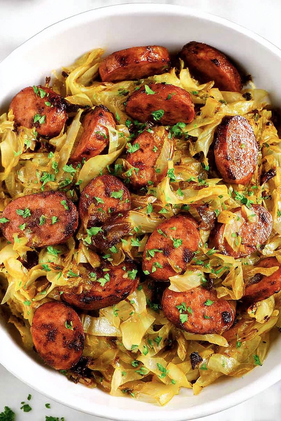 Smoked sausage brings deep flavor and cooks fast. I slice it thin so each piece warms through and browns in the pan. The taste fills the skillet and moves through the cabbage.