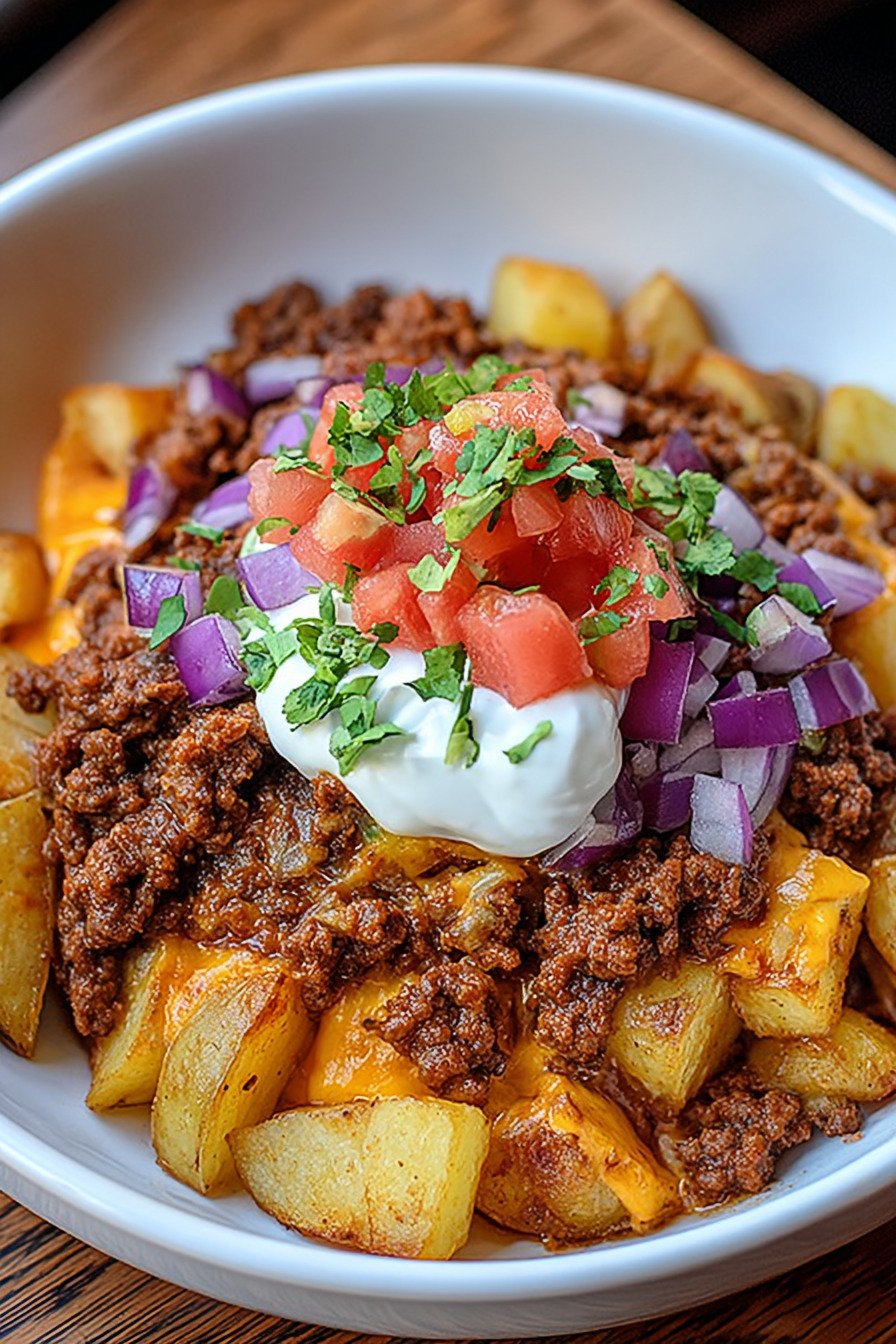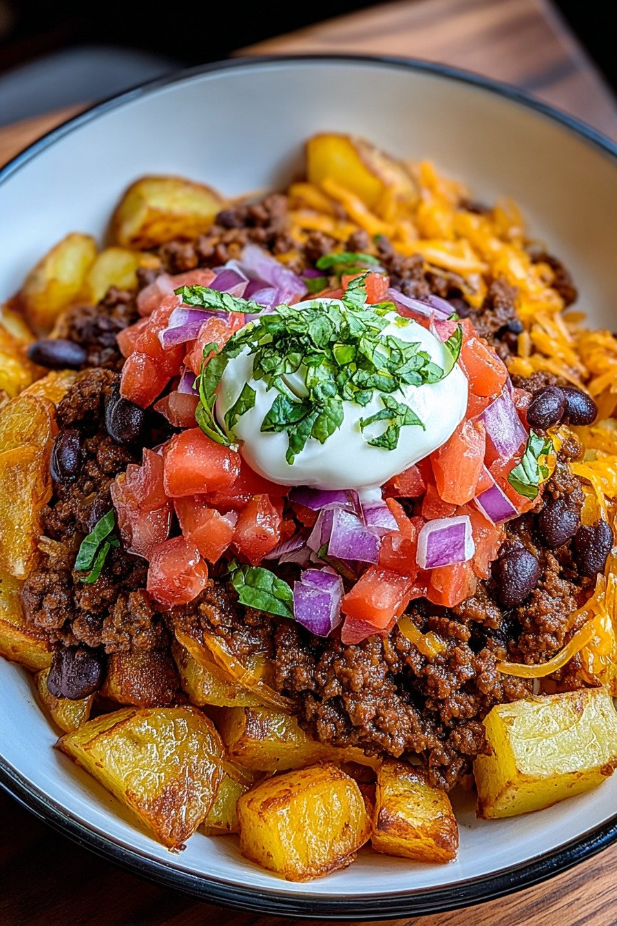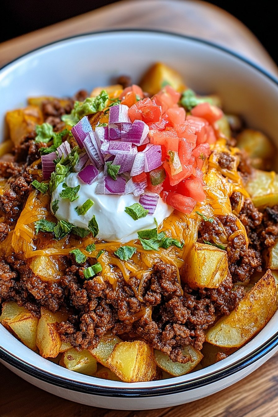 I cook this taco bowl when the day runs long and everyone wants real food now. We use tender potatoes, seasoned ground beef, and a bright finish of tomato and lime. The bowl eats hearty, yet it fits the way we try to eat clean. It slides right into ground beef healthy recipes and never feels fussy. We keep the flavor big. I toast the spices so they bloom. Warm potatoes soak up every drop. The beef turns rich and savory. Fresh lettuce and salsa cool the bite, while a spoon of yogurt gives a light, creamy lift. My kids call it taco night in a bowl and I call it dinner that actually gets done. This works for busy workdays and lazy Sundays. It checks many boxes for ground beef taco recipes and any taco ground beef recipe we crave. If you love potato and ground beef recipes or even potatoes and ground beef recipes from grandma’s table, this fits. Fans of a taco bell ground beef recipe will feel at home, only fresher. Ground Beef Recipes For Dinner live here, with simple steps that make sense.