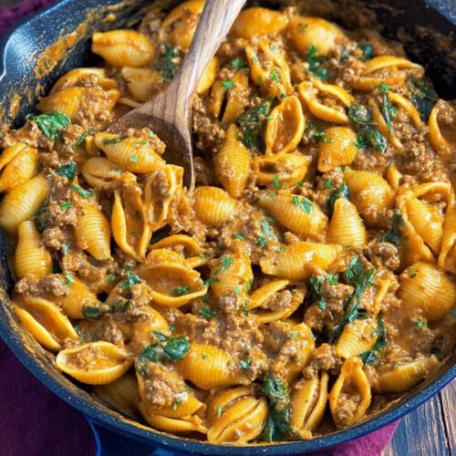 I love a cozy bowl of creamy shells with beef. The sauce hugs each shell and the beef feels tender and rich. On busy nights I want food that works hard and tastes great. This fits right in. It checks the box for ground beef healthy recipes and it still feels like comfort food we grew up with. We make it in one pan. The pasta cooks right in the sauce so cleanup stays light. The flavor builds fast with onion, tomato paste, broth, and a warm blend of Italian seasoning, garlic powder, and smoked paprika. Spinach melts into the pot for color and a soft bite. Cheddar gives lift and Greek yogurt brings a smooth finish. It is a keeper for recipes with ground beef and recipes for ground beef when time runs short. Friends keep asking for more ideas. I point them here when they want crockpot pasta recipes ground beef for weekends or a stuffed pasta shells recipe beef for a nice family meal. This simple bowl belongs on any list of the best ground beef recipes. We eat, we smile, we go back for one more spoon.