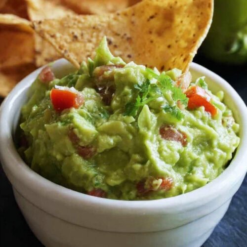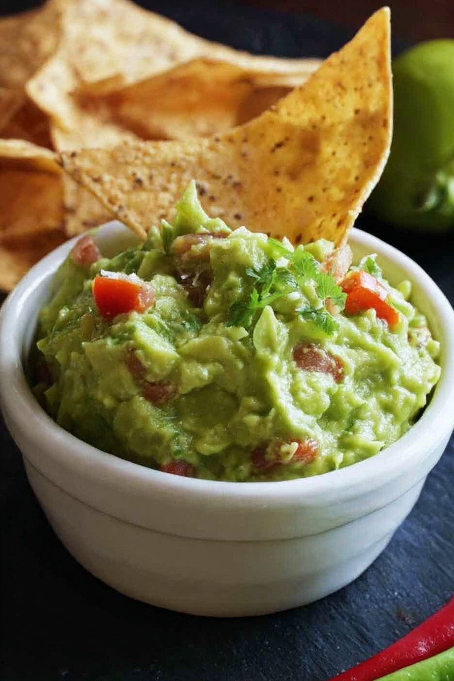 Avocados Ripe avocados form the base of this guacamole recipe. I look for skin that feels firm yet soft under light pressure. Inside, the flesh should look green and smooth. They give the dip its rich feel and mild taste.