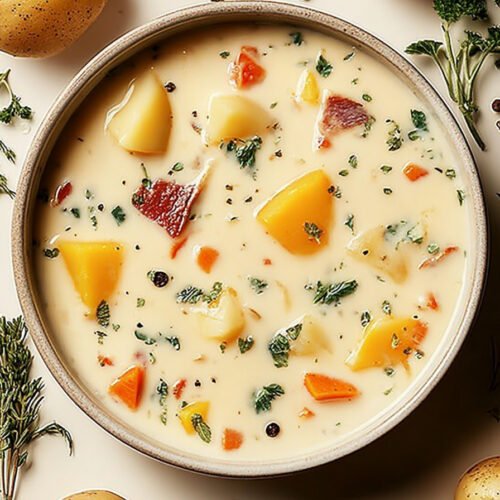 I make this potato soup when the day feels a little gray and the fridge looks quiet. Thick but smooth, it eats like a hug. The broth stays gentle and the potatoes keep their bite. You taste onion and garlic first, then bacon, then a soft cheddar finish. I use one pot on the stovetop and keep the steps calm. A quick sauté wakes up the base. A light flour stir builds body. Warm stock rolls in, then milk, and it settles into a steady simmer. I test a cube with a fork and call it when the edges yield. We pile bowls with scallions and a spoon of sour cream. Sometimes extra bacon lands on top. It works for a late lunch or the easy dinner we promised ourselves. This creamy potato soup stays friendly to swaps and welcomes leftover ham or rotisserie chicken. If you love a simple potato soup recipe and want a potato soup recipe stovetop that feels like home, this soup fits. Fans of soup and the chicken salad chick potato soup recipe crowd will feel right at home with this soup recipe.