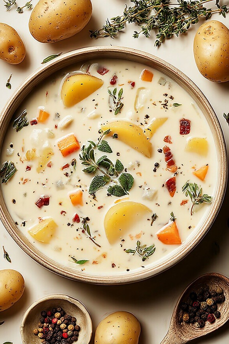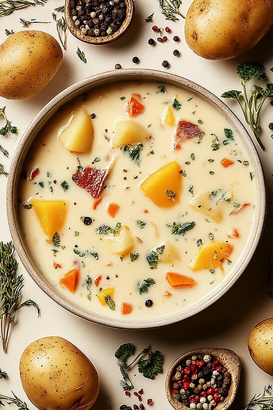 I reach for potato soup on cool days when I want peace in a bowl. Potato soup steadies me. Steam rises and smells like onion and cheddar and bacon. The spoon meets a rich surface and dips into soft cubes that still stand up. Two bowls sometimes happen, and I do not argue with that.