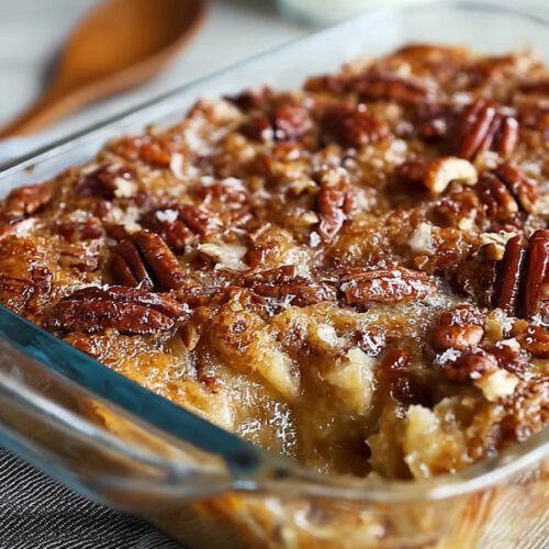 The method stays simple. We layer and we do not stir. The oven melts the butter into the mix and builds a crumbly lid. The center holds a soft pecan custard. It tastes like a fair slice of pie and a cozy spoon cake at once. The house smells sweet and toasty. I breathe and feel better.
