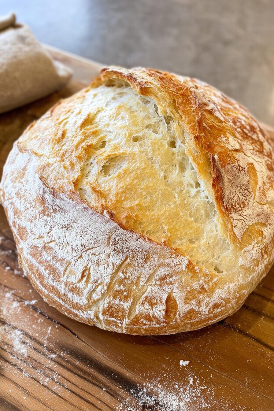 Step 6 Bake covered first to trap steam, then uncover for the final part of baking so the crust becomes deeply golden and crisp. Let the bread cool fully before slicing to preserve the crumb and flavor.