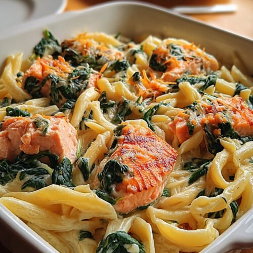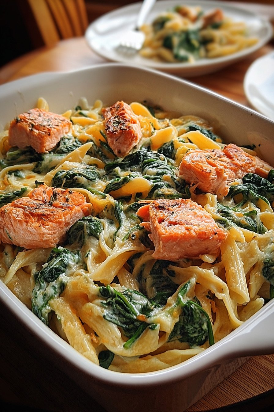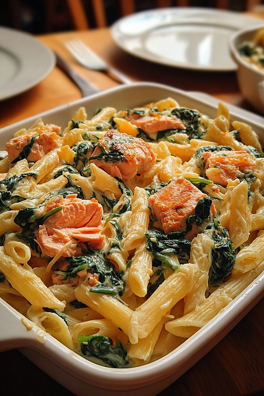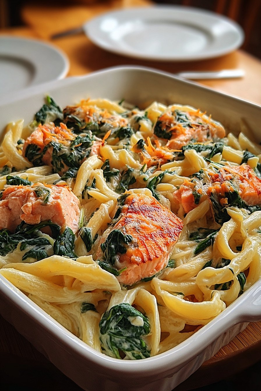 Spinach dinner recipes don’t have to be boring—and this creamy salmon pasta proves it. We’ve all had one of those days where the fridge looks like a sad collection of leftovers and forgotten greens. This dish was born on a Wednesday night just like that, with a bag of spinach on its last leg and a piece of salmon waiting to be useful. What came out of my kitchen that night? A silky Alfredo-style pasta with just enough garlic to make your kitchen smell like a five-star bistro. The salmon flakes apart gently into the cream sauce, the spinach wilts like a charm, and the whole thing feels a little luxurious without trying too hard. I mean, who says dinner has to be complicated? Whether you’re trying to sneak more greens into your life or just craving something that’s warm, satisfying, and doesn’t require a trip to the grocery store, this recipe’s got your back. And if you’ve got leftovers, lucky you. It reheats like a dream. It’s one of those baked dinner ideas that actually gets better the next day.