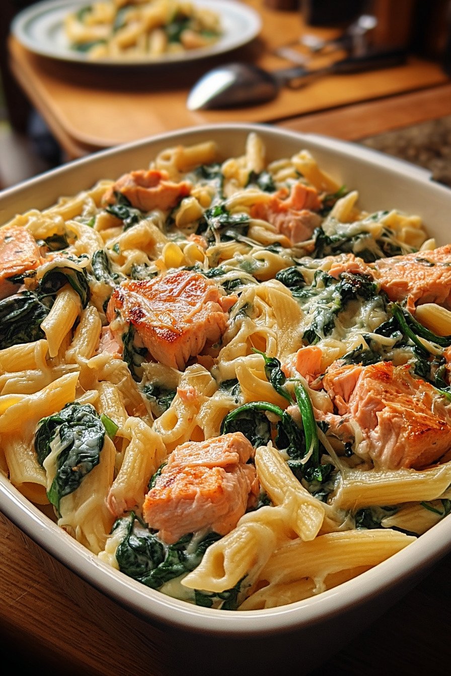 What you gain here is a method you can trust. The pasta cooks to a gentle bite. The salmon flakes clean. The spinach keeps color. The cream stays smooth. You can swap shapes of pasta or switch to another fish. The steps hold. With this playbook you will cook with steady hands and serve a bowl that brings people back to the table.